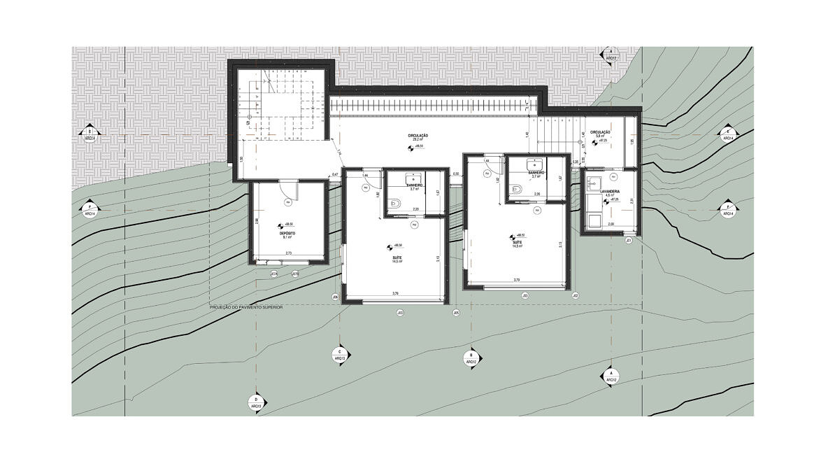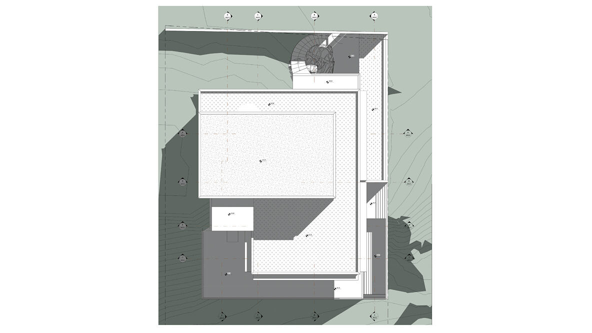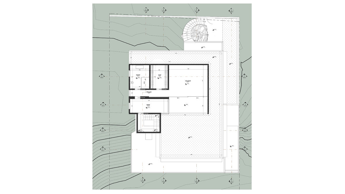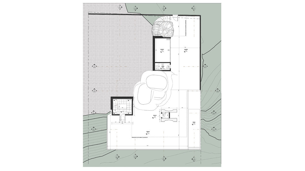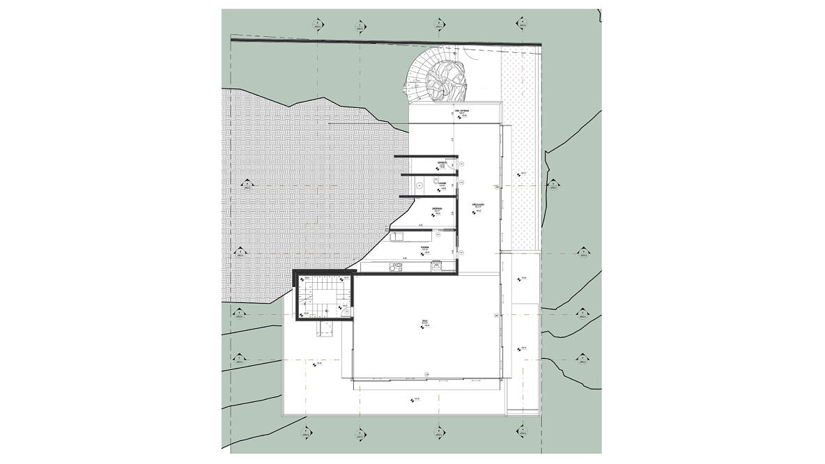 Essa residência não se desenvolve apenas em torno de um programa; se desenvolve em torno de uma rocha. Desde o primeiro contato com o terreno a rocha de granito se fez absoluta. Foi em torno da sua forma e textura que foi se estruturando o projeto.