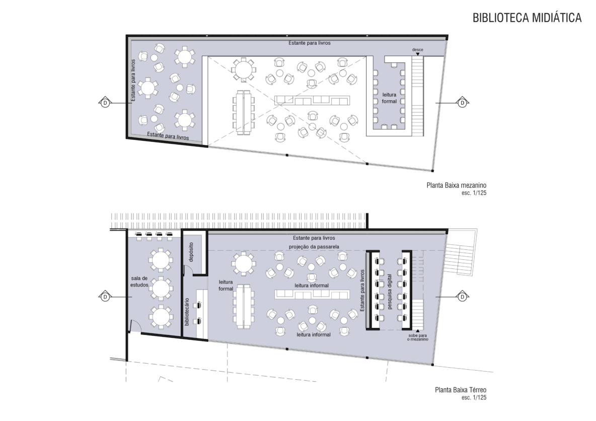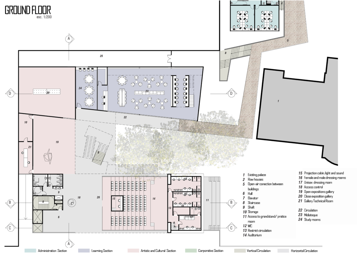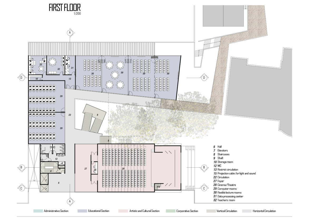 Essa decisão integra a construção com seu entorno público e privado e oferece generosamente ao público um novo local de interesse cultural para Botafogo e para o Rio de Janeiro. As salas de exposição, uma aberta e outra fechada estão aqui. A biblioteca também. O teatro/cinema foi elevado do andar térreo para dar lugar ao auditório. Neste espaço percebemos a possibilidade de haver uso permanente, seja como auditório, seja como um local de estar para os usuários do Prédio. Pelo uso de cortinas ele pode ser fechado tanto visualmente para o público quanto permitir o condicionamento de ar no seu interior. Um prisma em vidro delimita o foyer do teatro. Com a tela de projeção fechada o espaço tem seu uso normal. Com ela aberta faz-se a conexão visual entre o interior e os jardins. Neste arranjo é possível trazer o palacete e seus jardins para dentro do teatro.
