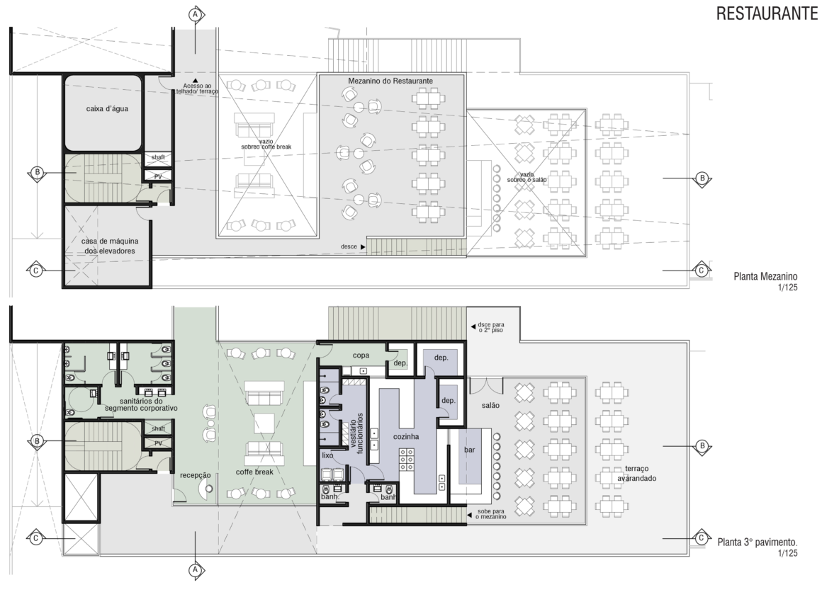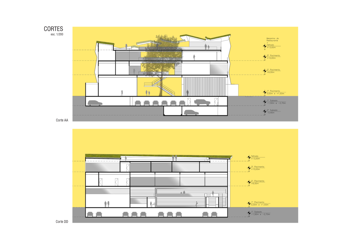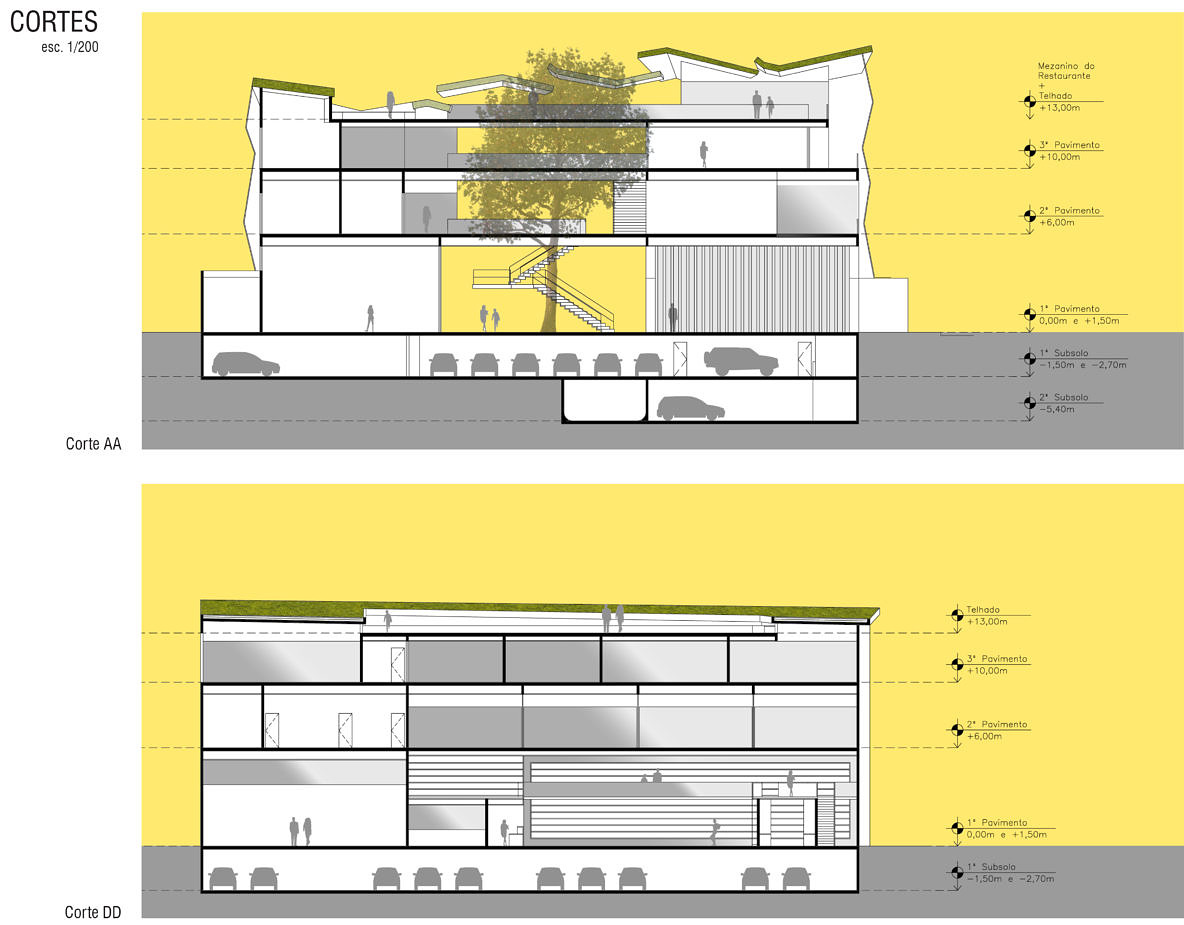 Com o intuito de ter a maior quantidade possível de espaços cobertos, mas abertos e com vistas adotamos o uso do terraço como no caso do restaurante sobre o teatro. O andar térreo do prédio foi concebido para ser o mais livre e aberto possível, de forma a trazer para dentro os jardins do palacete e o espaço público da rua Guilhermina Guinle.