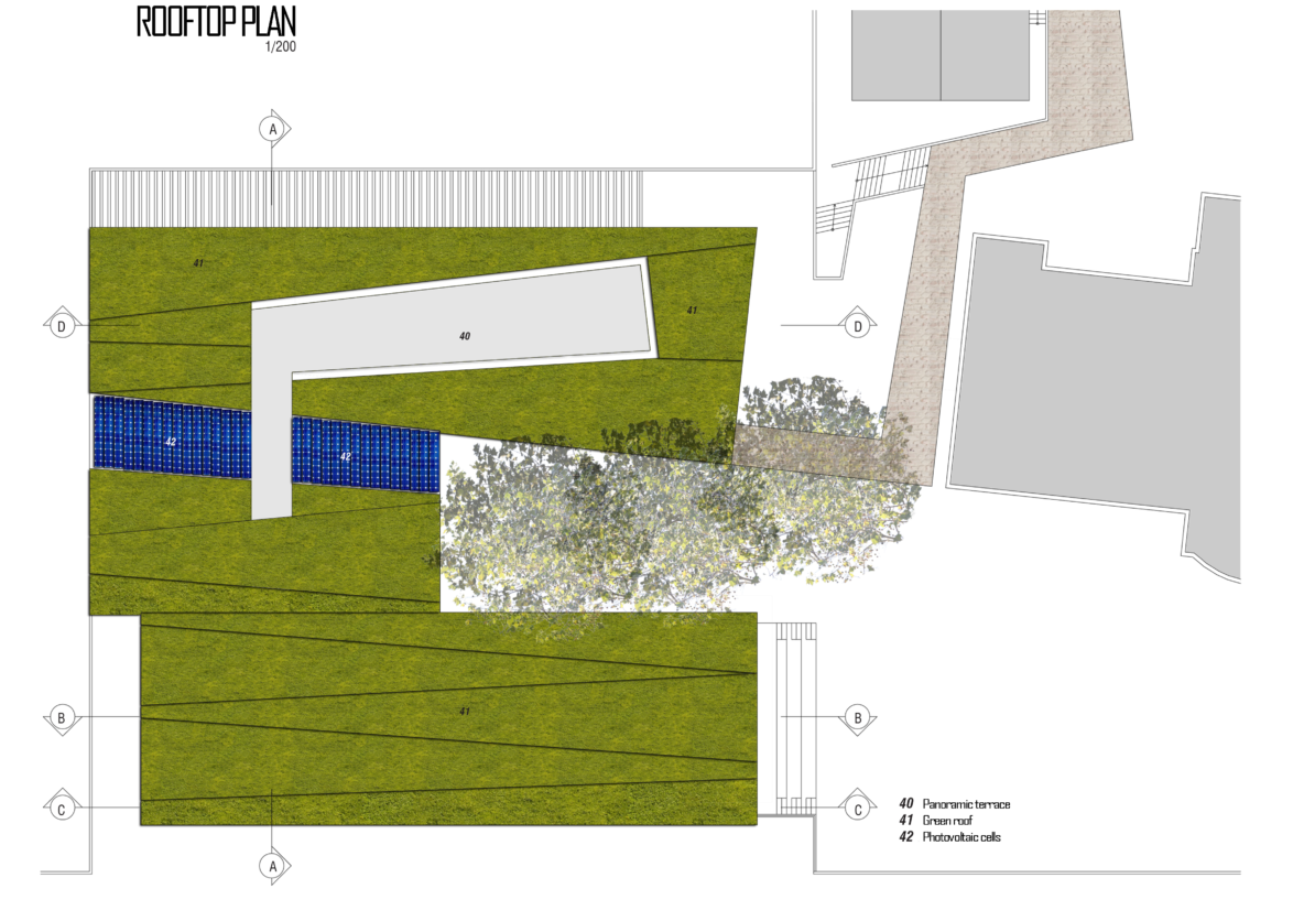 Dessa forma foi minimizada ao máximo a área sujeita ao uso de ar condicionado, pela adoção do conceito de resfriamento passivo reduzindo a demanda de energia. Na cobertura, ao mesmo tempo que aberturas permitem a entrada no prédio da iluminação natural, acontece a exaustão do ar interno. Essa cobertura capturará água da chuva para reuso em rega e sanitários além de ser coberta por vegetação para isolar termicamente os ambientes sob ele. Outra característica importante da cobertura vegetal é anular o ‘efeito de ilha de calor’ ao reduzir o impacto do ‘foot print’ do novo prédio.