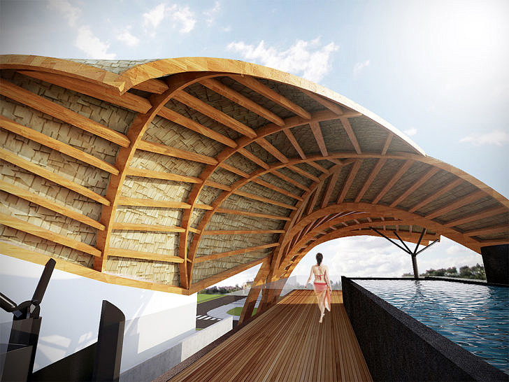 Os materiais utilizados na construção são provenientes de regiões próximas , como a taubilha, e a estrutura de MLC (madeira laminada colada) de eucalipto completam a lista de ações visando baixo consumo de energia e a utilização de recursos renováveis.
