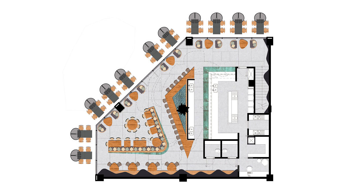 Como uma das culinárias mais presentes no cardápio do KOA é a asiática, em especial a japonesa, projetamos para a base da árvore um balcão, no melhor estilo dos restaurantes japoneses. Desta forma o cliente pode aproveitar uma refeição rápida e não precisa aguardar por uma mesa livre. A estrutura triangular fica muito próxima à cozinha aberta, criando uma intimidade entre staff e público.