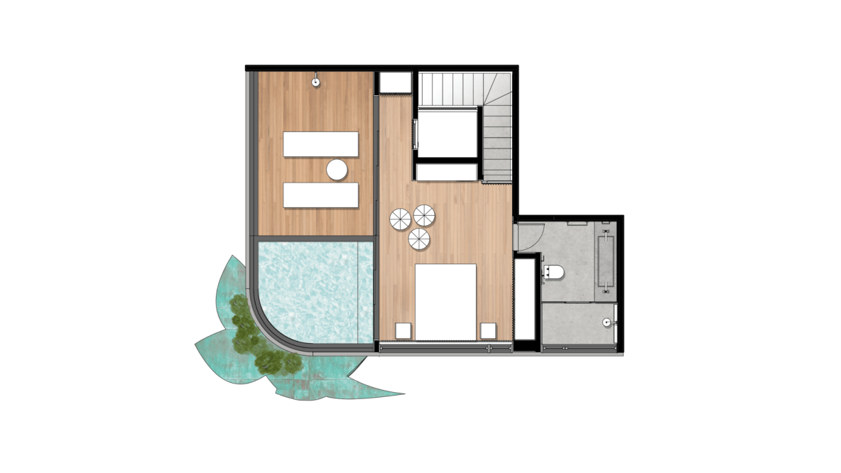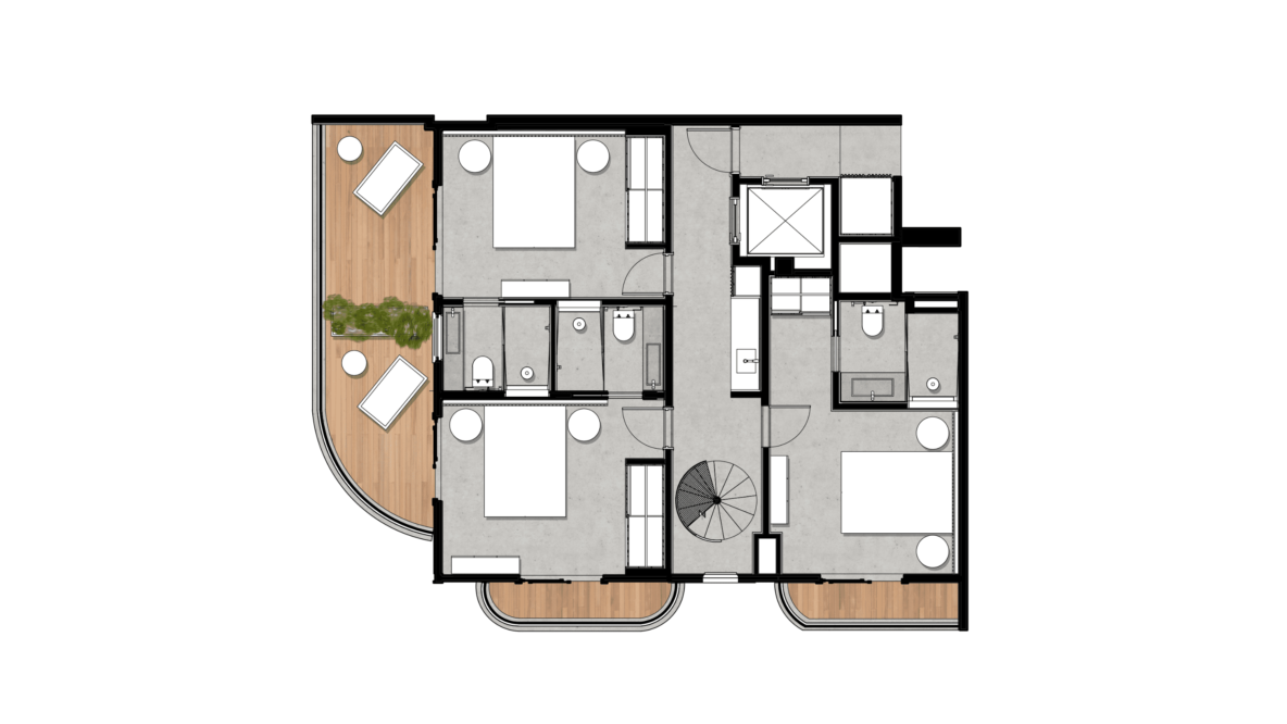 Para incrementar a estética orgânica criamos uma árvore que começa no primeiro andar e vai até o teto do segundo. Ela possui um pilar metálico envolto por peças de madeira cortadas a laser e dispostas em camadas. É um elemento que confere um toque artístico, tropical e exuberante ao triplex.